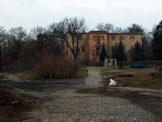 Ruiny stoj± na terenie byłego Zakładu Do¶wiadczalnego Instytutu Krajowych Włókien Naturalnych w Białobrzeziu.