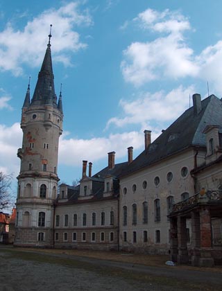 Pałac jest potężną wielotraktową budowlą z wielką wieżą od strony północno - wschodniej oraz drugą, mniejszą od strony północno - zachodniej.