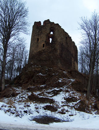 Kamienne założenie znajdujące się na wzgórzu składało się najpewniej z budynku mieszkalnego, dziedzińca i bramy, a całość była otoczona kamiennym murem i fosą. W późniejszym okresie wybudowano nowy budynek mieszkalny, łączący się z widoczną do dziś wieżą.
