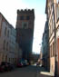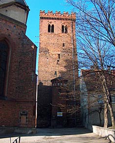 Niezwykle osobliwym i niepowtarzalnym zabytkiem jest "z±bkowicka krzywa wieża" - stara dzwonnica, która osunęła się na skutek podmokło¶ci terenu lub niewielkiego trzęsienia ziemi. Jej odchylenie w pionie wynosi 1,5 m, sama wieża ma za¶ 34 m. wysoko¶ci. Najniższa, XIV - wieczna czę¶ć wieży zbudowana jest z kamienia, pozostała z cegły.