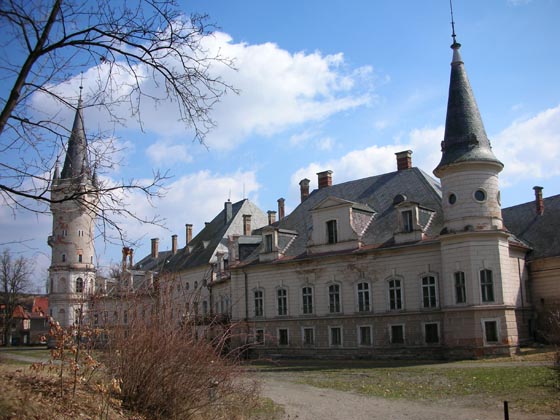 Pałac jest potężną wielotraktową budowlą z wielką wieżą od strony północno - wschodniej oraz drugą, mniejszą od strony północno - zachodniej.