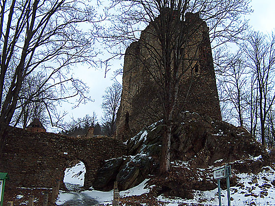 Kamienne założenie znajdujące się na wzgórzu składało się najpewniej z budynku mieszkalnego, dziedzińca i bramy, a całość była otoczona kamiennym murem i fosą. W późniejszym okresie wybudowano nowy budynek mieszkalny, łączący się z widoczną do dziś wieżą.